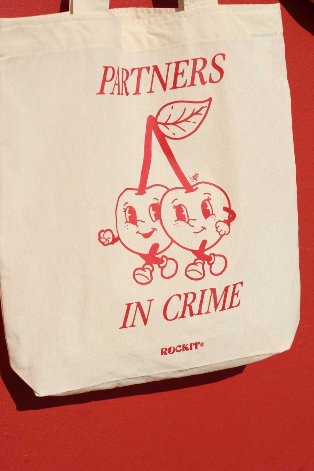 • POSSUI ESTAMPA CORRIDA COM DESENHO DE DUAS CEREJAS COM ROSTO NO ESTILO VINTAGE COM A FRASE: "PARTNERS IN CRIME" TRADUÇÃO: PARCEIROS DE CRIME.